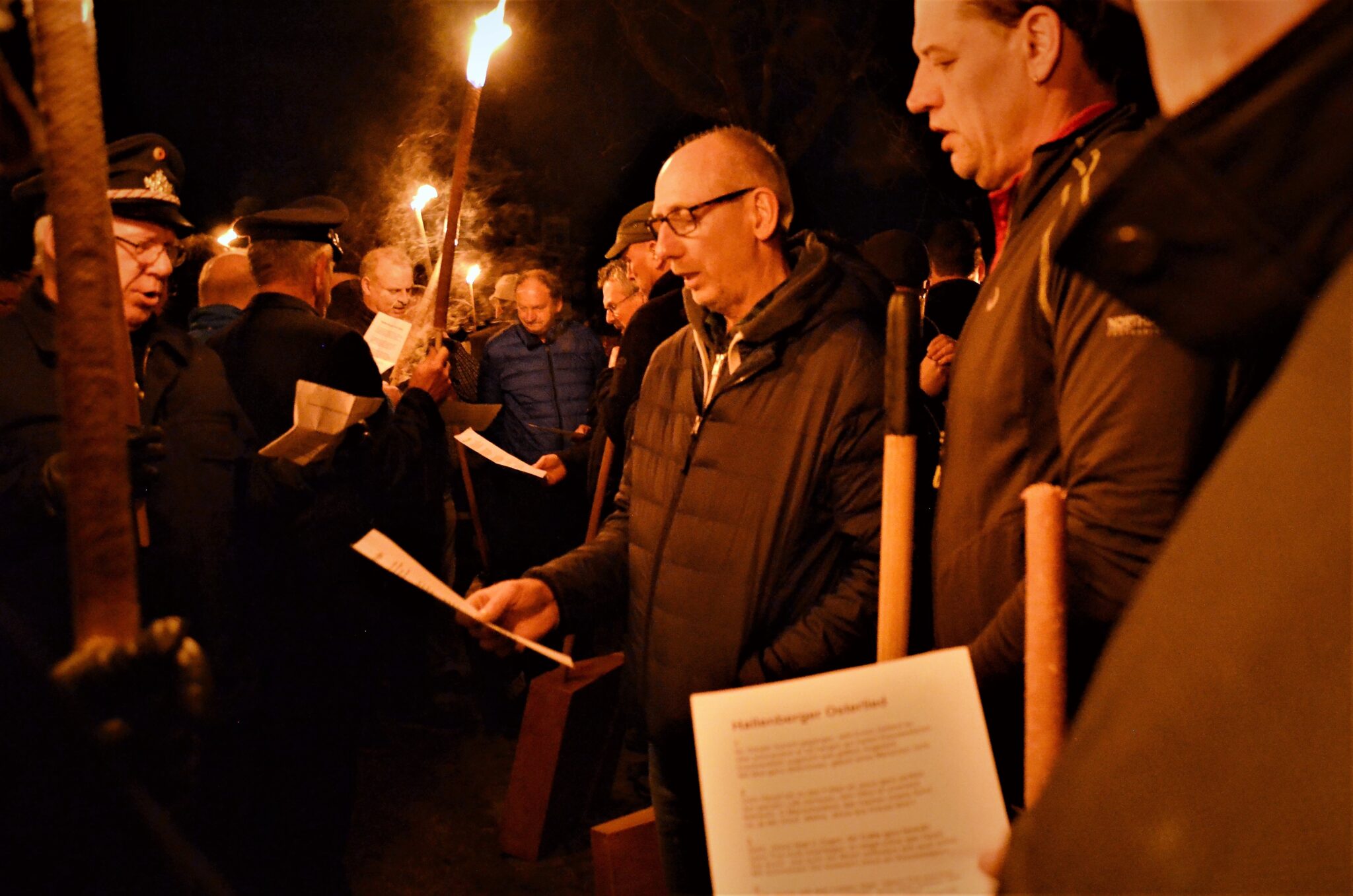 Mitternacht. Hunderte Leute stehen in Hallenberg auf dem Marktplatz vor der Pfarrkirche St. Heribert. Es ist stockdunkel. Die Straßenbeleuchtung ist aus. In keinem Haus brennt mehr Licht. Die Turmuhr schlägt. Zwölf Mal. Stille. Jetzt ist Ostersonntag. Nach dem zwölften Schlag beginnen die Männer zu singen: