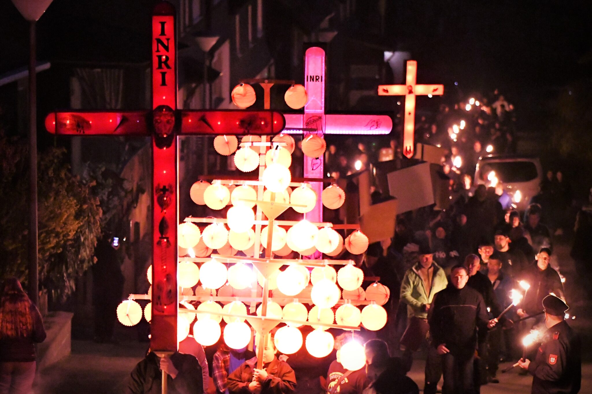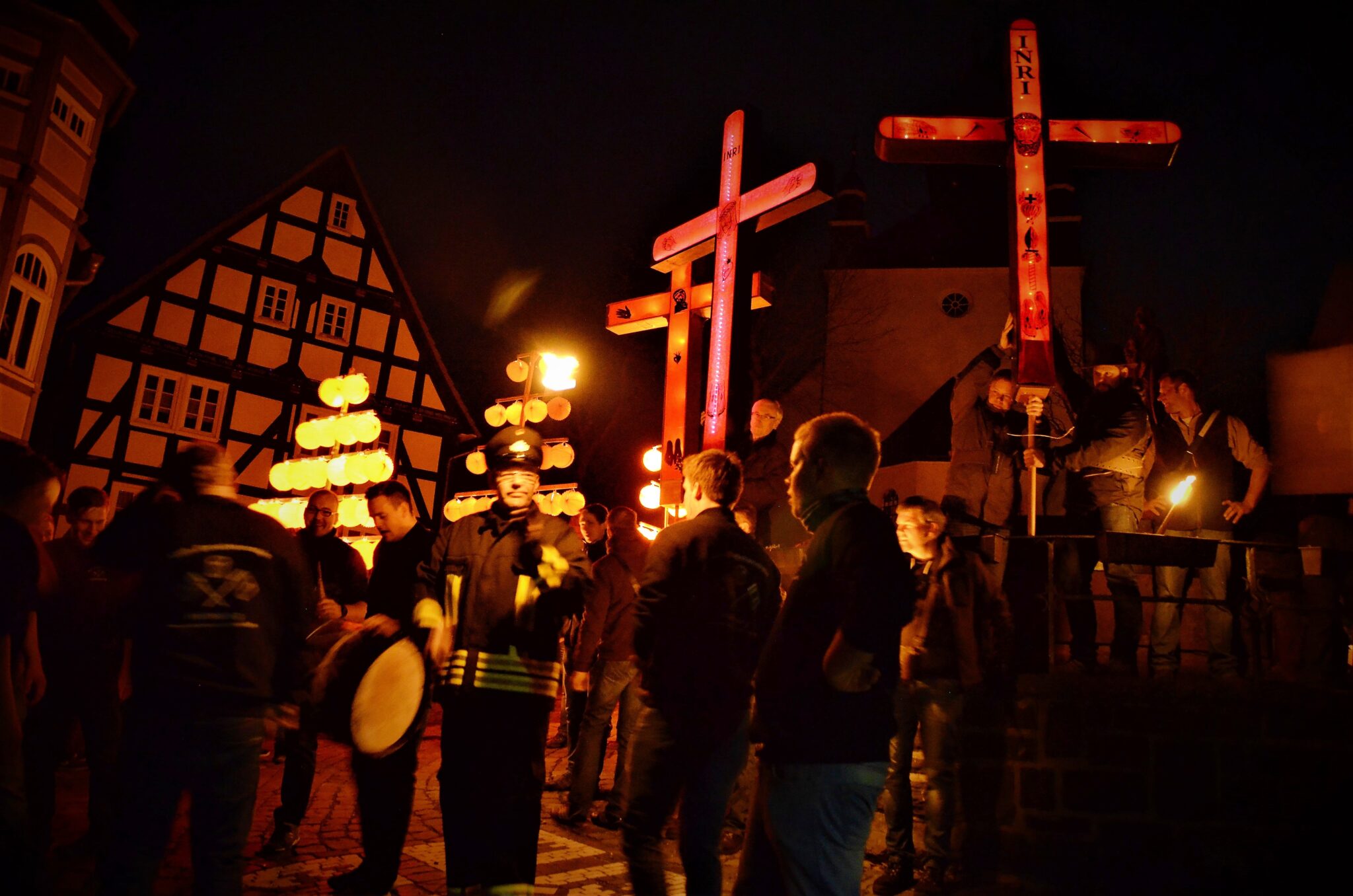 Für Außenstehende könne der Brauch durchaus skurril wirken, gibt Glade zu. Für ihn stehe jedoch der Aspekt der Verkündigung im Mittelpunkt. Die gesamte Stadt werde umrundet: „Alle sollen es mitbekommen – das Leiden und das Erlösungswerk Christi.“ Der Zug sei schmerzhaft, laut, chaotisch – so wie es Jesu Passion eben auch war. Aber: „Aus diesem Chaos ragen die drei Kreuze heraus – ganz ruhig mitten in diesem infernalischen Lärm. Sie sind immer zu sehen.“ Durch die Beleuchtung der Kreuze wird der rote Stoff, mit dem sie behängt sind, transparent. Nach vorne schimmern das aufgemalte Antlitz Jesu und die fünf Wundmale. Nach hinten strahlt, für die Teilnehmer des Umzugs immer sichtbar, die Aufschrift der Kreuze: ave, spes unica, sei gegrüßt, einzige Hoffnung. Auch das eigene Leben könne oft chaotisch erscheinen, chaotisch wie das Treiben auf den Hallenberger Straßen während der Osternacht. Dem stelle sich das Kreuz entgegen: „Mitten im Chaos steht das Kreuz – in der Welt wie in unserem Umzug. Das gibt Richtung, Halt und Orientierung“, sagt Glade.