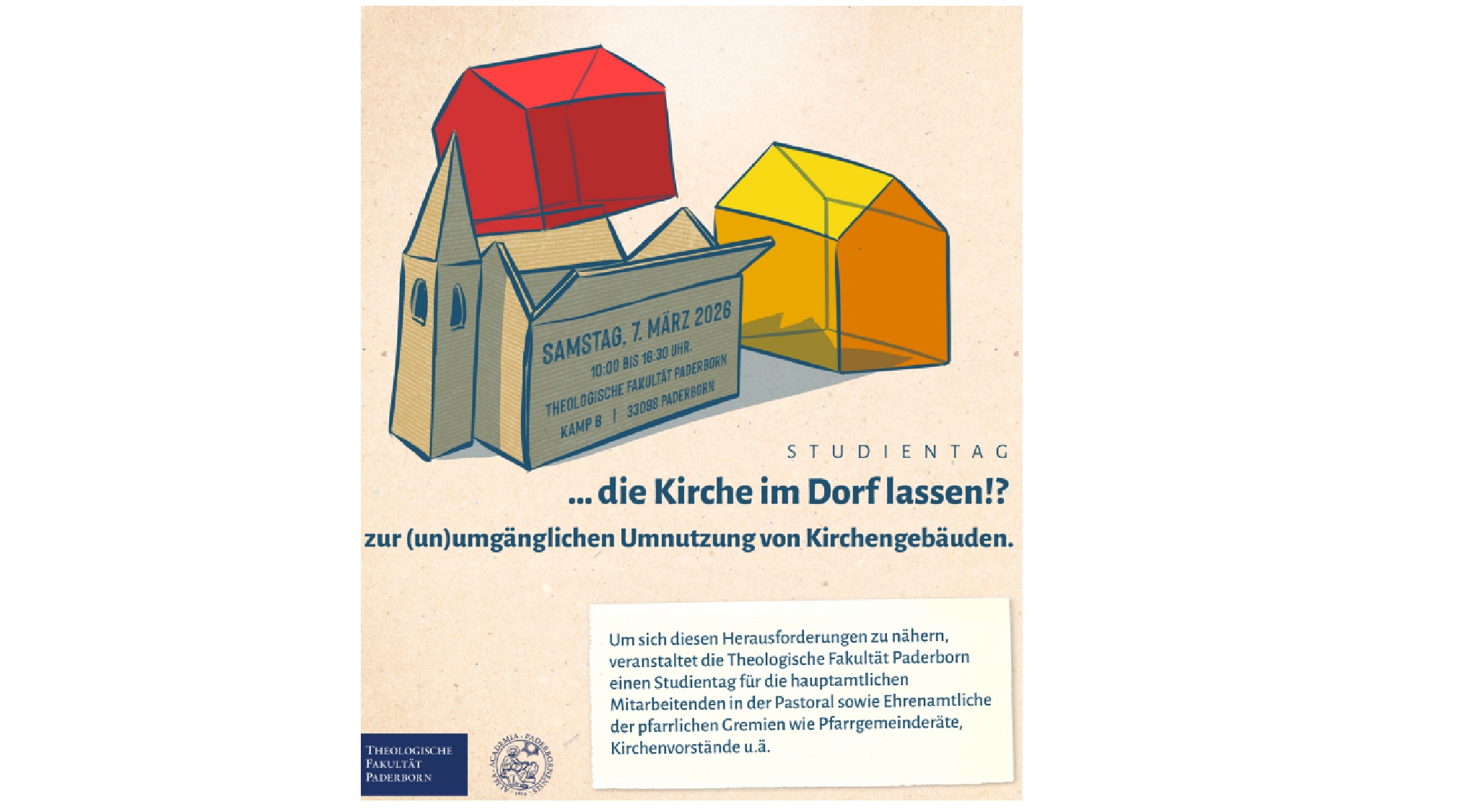 Paderborn (pdp). Viele Kirchen stehen leer, werden nur noch selten genutzt oder sollen sogar geschlossen werden. Die Frage nach der Umnutzung von Kirchengebäuden gehört zu den größten Herausforderungen der katholischen Kirche in Deutschland. In diese aktuelle Diskussion mischt sich am Samstag, 7. März 2026, ein vielversprechender Studientag der Theologischen Fakultät Paderborn ein: „… die Kirche im Dorf lassen!? Zur (un)umgänglichen Umnutzung von Kirchengebäuden“.